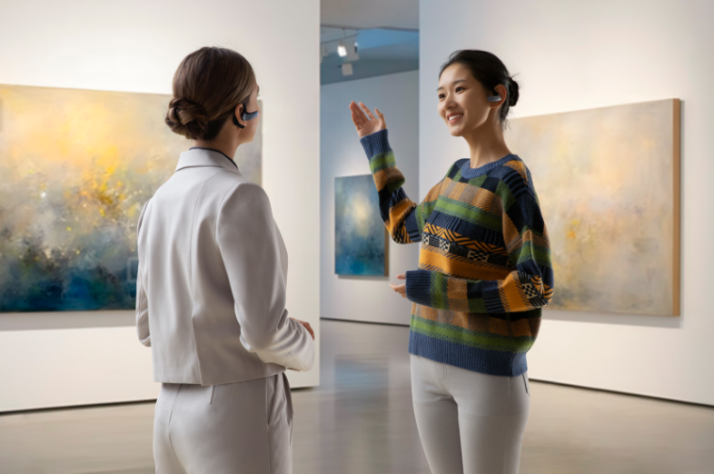 置身于海外展会、行业论坛或技术发布会现场,戴上耳机即可对环境中的外语内容进行持续翻译,双语转译结果随听随看。耳机支持5-8米远场拾音并配合AI降噪算法,哪怕坐在后排或环境嘈杂,也能清晰捕捉台上发言,实现边听边理解。
