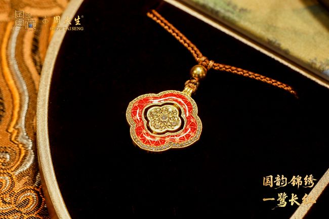 吉红满棠挂坠作为该系列典藏之作,以绽开的海棠花为造型主体,缀饰四合如意纹,汲取传统平安扣之形制精华,采用灵巧转轴结构,使中央饰件可悠然转动,内外双层构架尽显传统造物智慧。产品以霁红釉色珐琅为底,金丝勾勒,透窗珐琅映衬,呈现出金红交织的璀璨光华,寓意富贵永续、吉祥相随,既是可随身佩戴的守护臻品,亦是承载美好祝愿的传世之礼。
