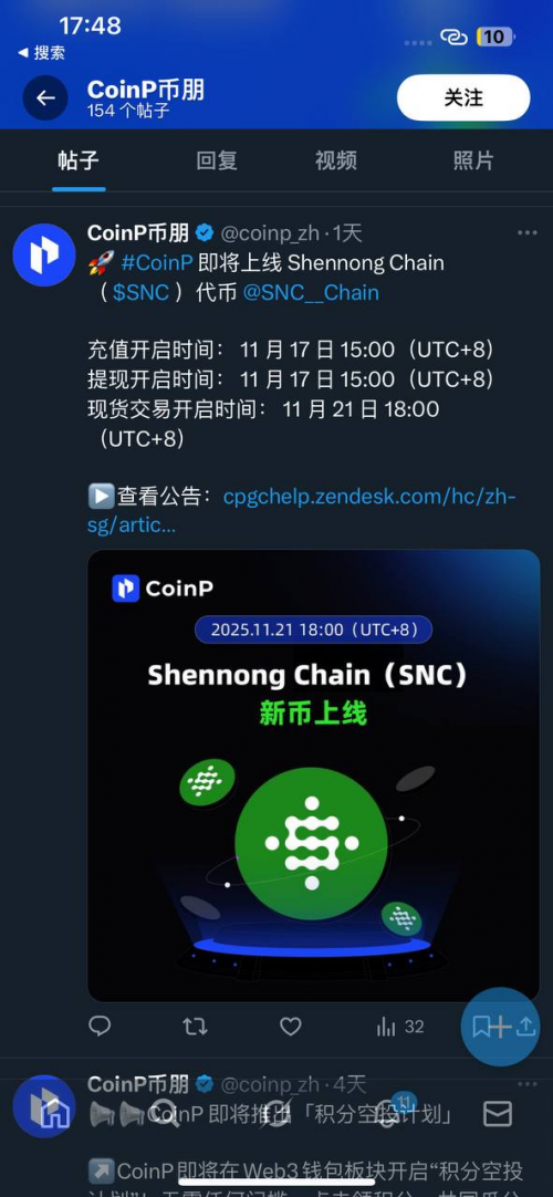 2025年11月15日全球领先的数字资产交易平台 CoinP 今日正式宣布,将于 2025 年 11 月 21 日首发上线公链项目 神农链(Shennong Chain,简称SNC),并同步开放充值、提现与现货交易服务。此次上线标志着农业真实世界资产(Agri-RWA)正式进入主流交易所视野,也代表 CoinP 正持续扩大其优质资产生态的全球化布局。