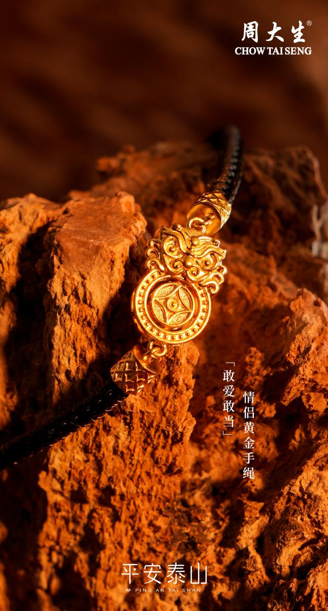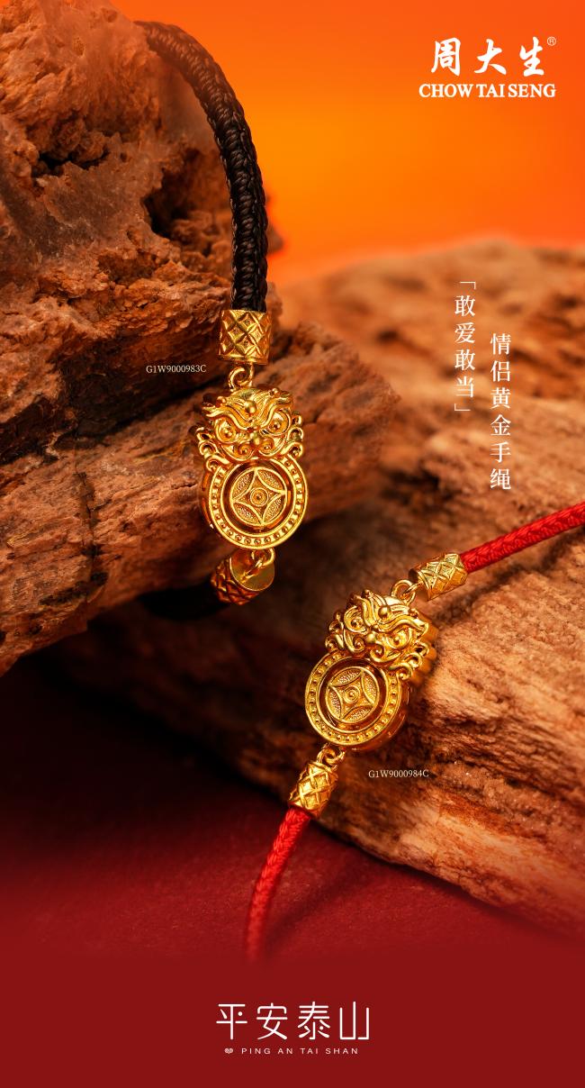 平安泰山系列聚焦东方文化中的守护智慧,以现代珠宝美学重新诠释石敢当的祥瑞意象。本次上新的时来运转·素金手绳,撷取石敢当口街金币的吉祥寓意,以古法金工艺重塑神兽轮廓。活动钱币采用可转动的灵巧设计,轻转之间,寓意时来运转、否极泰来,同时镇守财源、祸患不侵。黑红双色手绳的设计,蕴含着深刻的情感寓意:情侣双方佩戴,象征着将爱与守护彼此给予,一方以热情温暖对方,一方以沉稳守护彼此,共同构建稳固的情感关系。